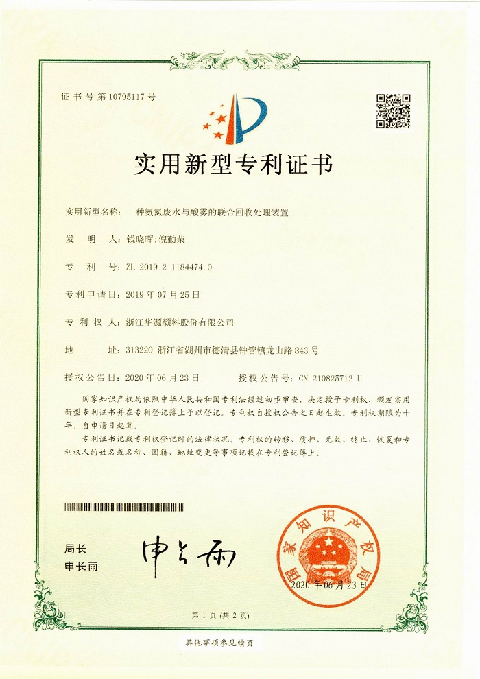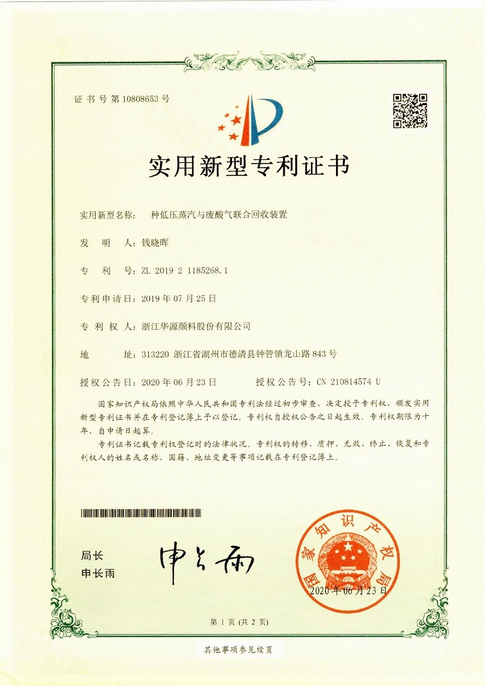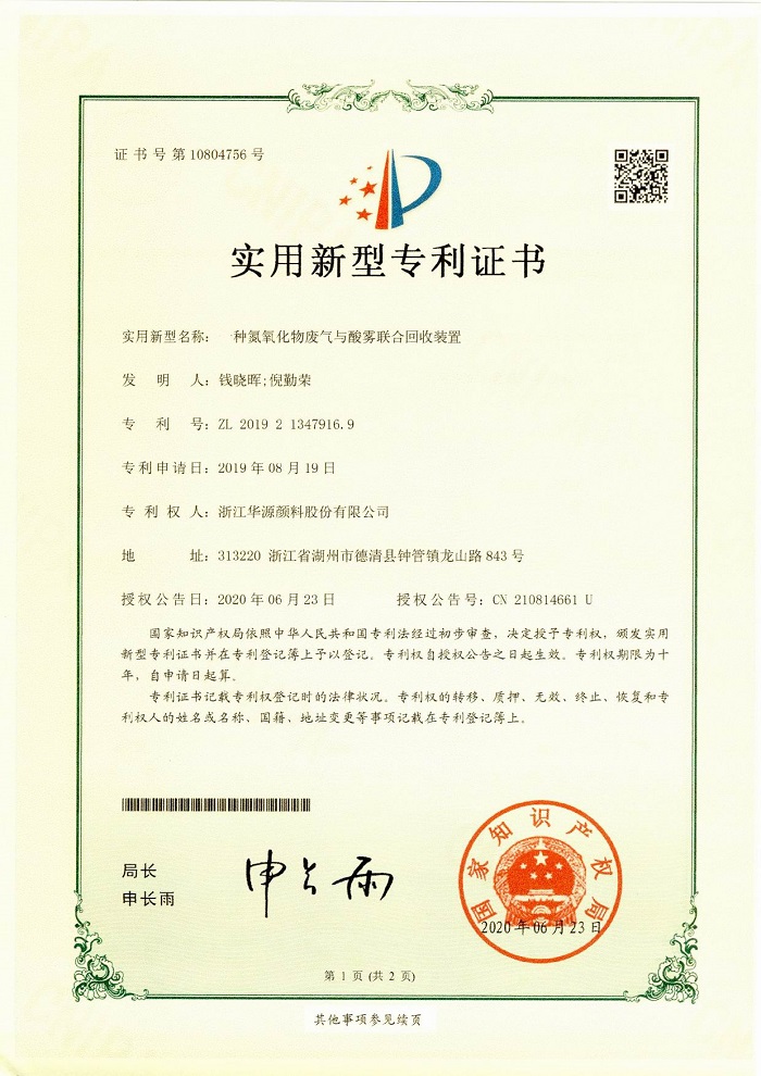 近日,升華集團所屬企業(yè)華源顏料6項實用新型專利獲國家知識產(chǎn)權局授權。這6項專利分別是:《一種氨氮廢水與酸霧的聯(lián)合回收處理裝置》、《一種工廠雨水收集利用裝置》、《一種低壓蒸汽與廢酸氣聯(lián)合回收裝置》、《一種投料倉》、《一種振動給料器》、《一種氮氧化物廢氣與酸霧聯(lián)合回收裝置》。