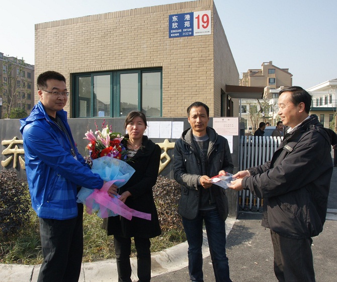 當(dāng)天上午8點(diǎn)38分,東港欣苑大門口,該鎮(zhèn)洋北村村民仲水根滿臉堆笑地從縣臨杭開發(fā)區(qū)管委會(huì)副主任繆曉林手中接過了8幢301室的鑰匙,他身旁的妻子則從升華地產(chǎn)集團(tuán)雷甸項(xiàng)目負(fù)責(zé)人楊韓狄的手中接過了升華送出的賀喜鮮花,歡迎該小區(qū)第一位業(yè)主的到來。
