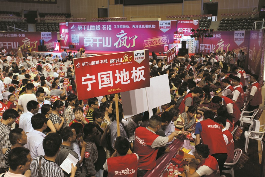6月7日,德清縣體育中心籃球館內(nèi)人聲鼎沸,“工廠空降 直銷江浙皖”,集團(tuán)所屬企業(yè)云峰新材莫干山衣柜•地板江浙皖三省聯(lián)動(dòng)在這里掀起搶購熱潮。上千名莫干山品牌忠實(shí)消費(fèi)者從江蘇、安徽以及省內(nèi)各地趕來,搶購自己心儀的莫干山品牌衣柜、地板產(chǎn)品。短短的3個(gè)小時(shí)成交1200多個(gè)訂單。火爆場面禁不住讓人驚呼:“莫干山瘋了!”