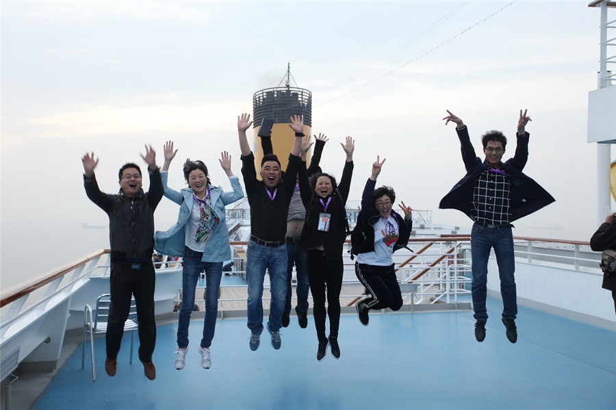 除了兩天時(shí)間登陸韓國(guó)濟(jì)州島與日本福岡短暫游覽之外,大部分時(shí)間是在郵輪上度過(guò)的。員工們站在海景船艙的陽(yáng)臺(tái)上,任海風(fēng)吹拂著臉龐,不時(shí)有海鷗從眼前掠過(guò)。晴朗的早晨,登上郵輪頂上的甲板,看日出也是別有一番風(fēng)味。